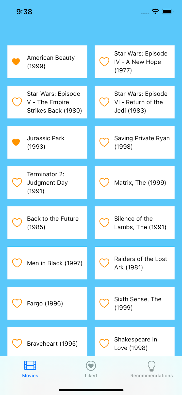 - En Xcode, selecciona Ejecutar para iniciar la app y agregar algunas películas a tu lista de Me gusta.